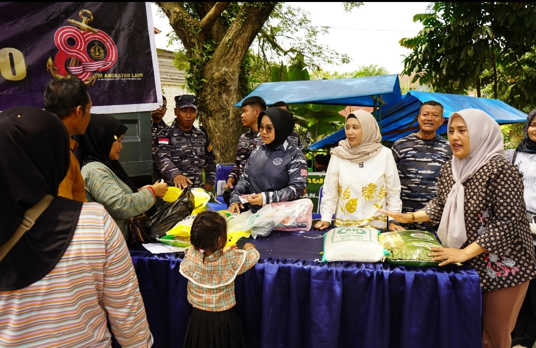TNI AL, Dumai,Swarantara.com-Dalam rangka memperingati Hari Jadi Ke-80 TNI Angkatan Laut, Pangkalan TNI Angkatan Laut Dumai kembali menunjukkan kepeduliannya kepada masyarakat dengan menggelar Bazar Murah Sembako di Desa Mangku Jaya, Kecamatan Sungai Sembilan, Kota Dumai, Rabu (24/09/2025).