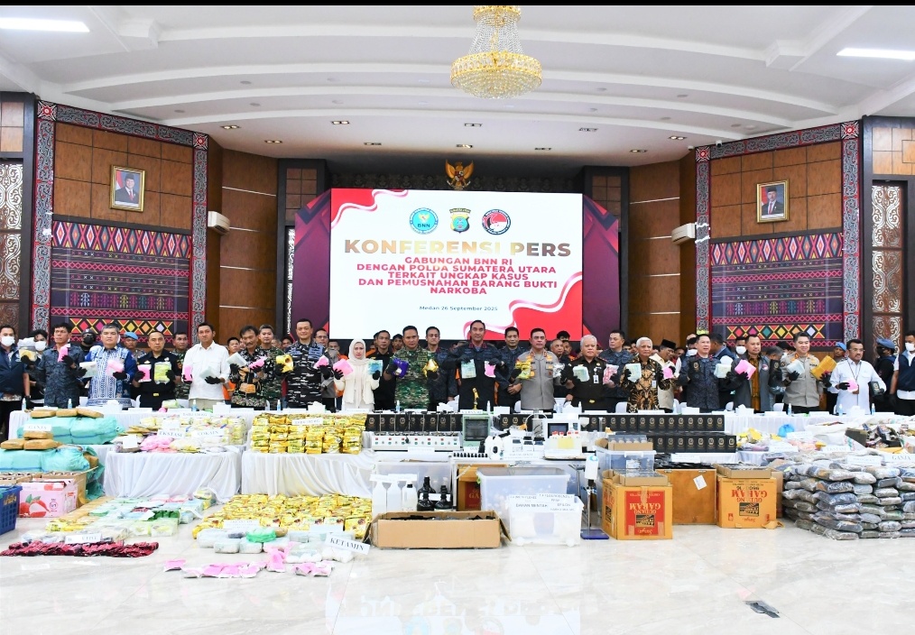 TNI AL, Belawan,Swarantara.com- Komandan Komando Daerah Angkatan Laut I (Kodaeral I) Laksamana Muda TNI Deny Septiana, S.I.P., M.A.P., menghadiri Konferensi Pers Gabungan BNN RI dengan Polda Sumatera Utara serta Pemusnahan Barang Bukti Narkoba yang dipimpin Kepala BNN RI Komjen Pol Suyudi Ario Seto, S.H., S.I.K., M.Si., bertempat di Aula Tribrata Polda Sumatera Utara, Jalan Sisingamangaraja, Medan, Jumat (26/09/2025).