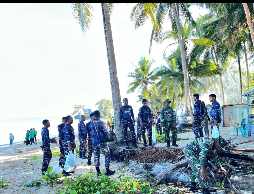 TNI AL, Ambon,Swarantara.com-Dalam rangka memperingati Hari Ulang Tahun (HUT) TNI Ke-80, jajaran TNI baik TNI Angkatan Darat, TNI Angkatan Laut dan TNI ANgkatan Udara yang bertugas di wilayah Kabupaten Kepulauan Aru menggelar aksi pembersihan lingkungan di tempat wisata Batu Kora, Desa Wangel, Kecamatan Pulau-Pulau Aru, Selasa (30/9/2025).